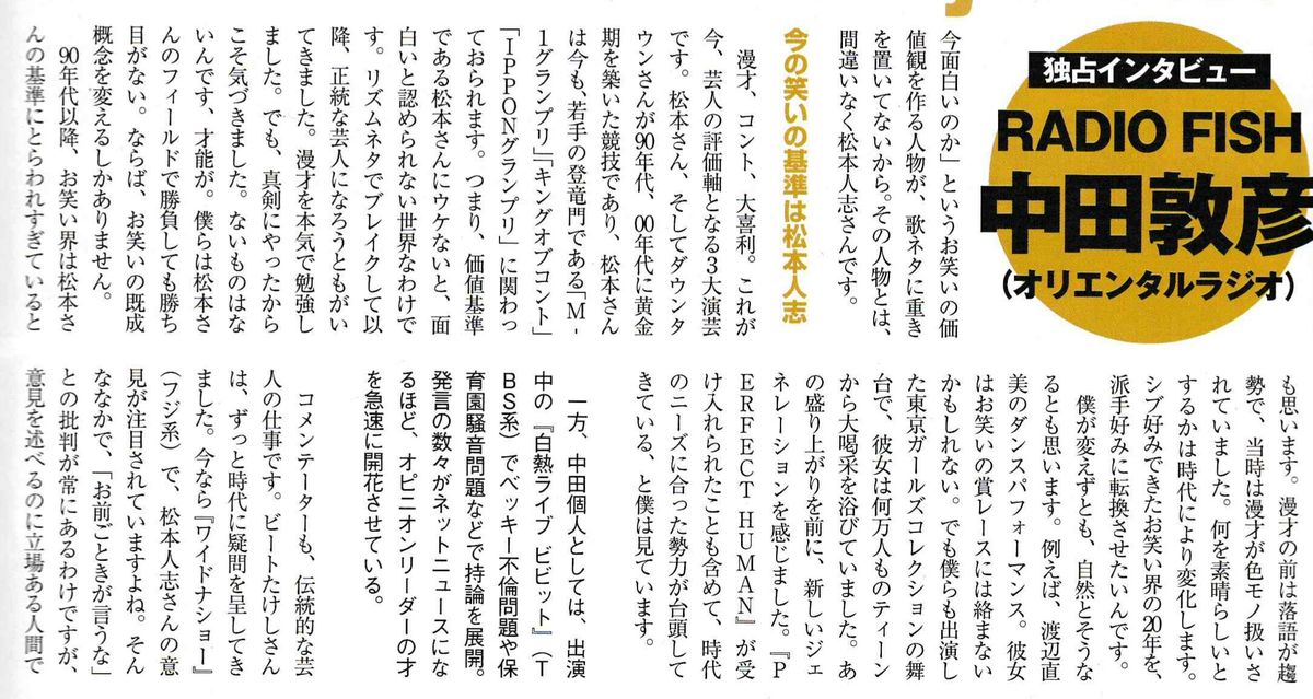 オリラジ中田「茂木健一郎を擁護し、暗に松本人志さんを批判するブログを書いたところ、吉本が全社をあげて大騒ぎし幹部と社長に謝れと言われてるところ」 「僕の意思としては謝らないと。人志松本に謝らない話、謝らなんなぁー言うてるところです」 「(ブログについて)世間は騒いでない。吉本内部だけ騒いでる」 松本に謝れと社長から直々に要求されとるのを拒否してる 松本からも直に電話きたが着拒したとライブで話している松本人志を批判したオリラジ中田敦彦 吉本社長らから「謝れ!」 - ライブドアニュース