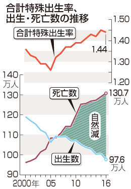 厚生労働省は2日、2016年の人口動態統計(速報値)を公表した。1人の女性が生涯に産む子どもの推計人数「合計特殊出生率」は1.44となり、前年から0.01ポイント低下。出生数が97万6979人と初めて100万人を割る一方、死亡数は戦後最多の130万7765人