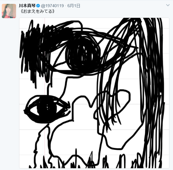 元カノのタレント加藤紗里は6月2日時点で反応はないが、一方でその加藤と大バトルを展開した元カノのシンガーソングライター川本真琴のツイートが“怖すぎる”と話題になっている。「《おまえをみてる》というタイトルの1枚の絵が、狩野の復帰の日に投稿されているのですが、じつに不気味。大小の2つの目、何かをかたどったような線、その周りはマジックでむちゃくちゃに塗りつぶされており、かなりシュールです。まるで陰鬱な心象風景画のようですね」(週刊誌記者)