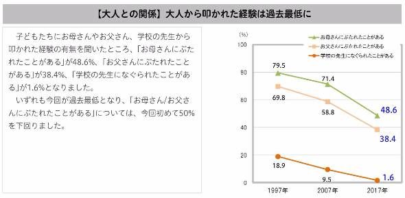 また、「親からお小遣いをもらっている」と答えた子どもは15.9ポイント減の63.0%。 子どもの金銭感覚を養うための教育も変わっているようだ。 では、こうした教育方針の変化により、現代の子どもの価値観はどう変わっているの だろうか。「自分の部屋に両親が入ってくるのは嫌だ」と考える子どもは、20年前から 9.4ポイント少ない36.6%、「家族に言えない秘密がある」と答えた子どもは16.0ポイント減の34.3%。 親密度が向上し、親子関係がよりオープンになっていることが分かった。大人に「ぶたれた」経験のある子どもの数、過去最低に